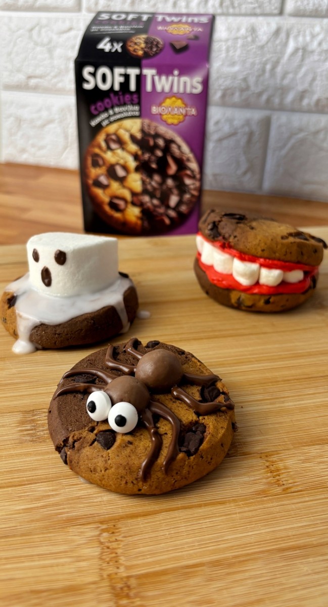 3. Σε ένα μπολ ανακατεόυμε τυρί κρέμα με ζάχαρη άχνη και προσθέτουμε κόκκινο χρώμα ζαχαροπλαστικής. Αλείφουμε την κρέμα στο μπισκότο και τοποθετούμε τα marshmallows σε σχήμα δοντιών και καλύπτουμε από πάνω με ένα ακόμη μπισκότο!