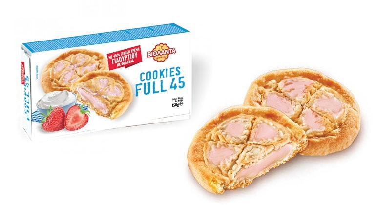 Απολαυστικά μπισκότα FULL 45! Tα μόνα με 45% γέμιση κρέμας σε διάφορες γεύσεις: μαύρη σοκολάτα, φουντούκι, φιστικοβούτυρο ή γιαούρτι με φράουλα. Η τραγανή του επιφάνεια συνδυάζεται τέλεια με την λαχταριστή γέμιση του μπισκότου η οποία γεμίζει το στόμα και αφήνει άφωνους και τους πιο απαιτητικούς.